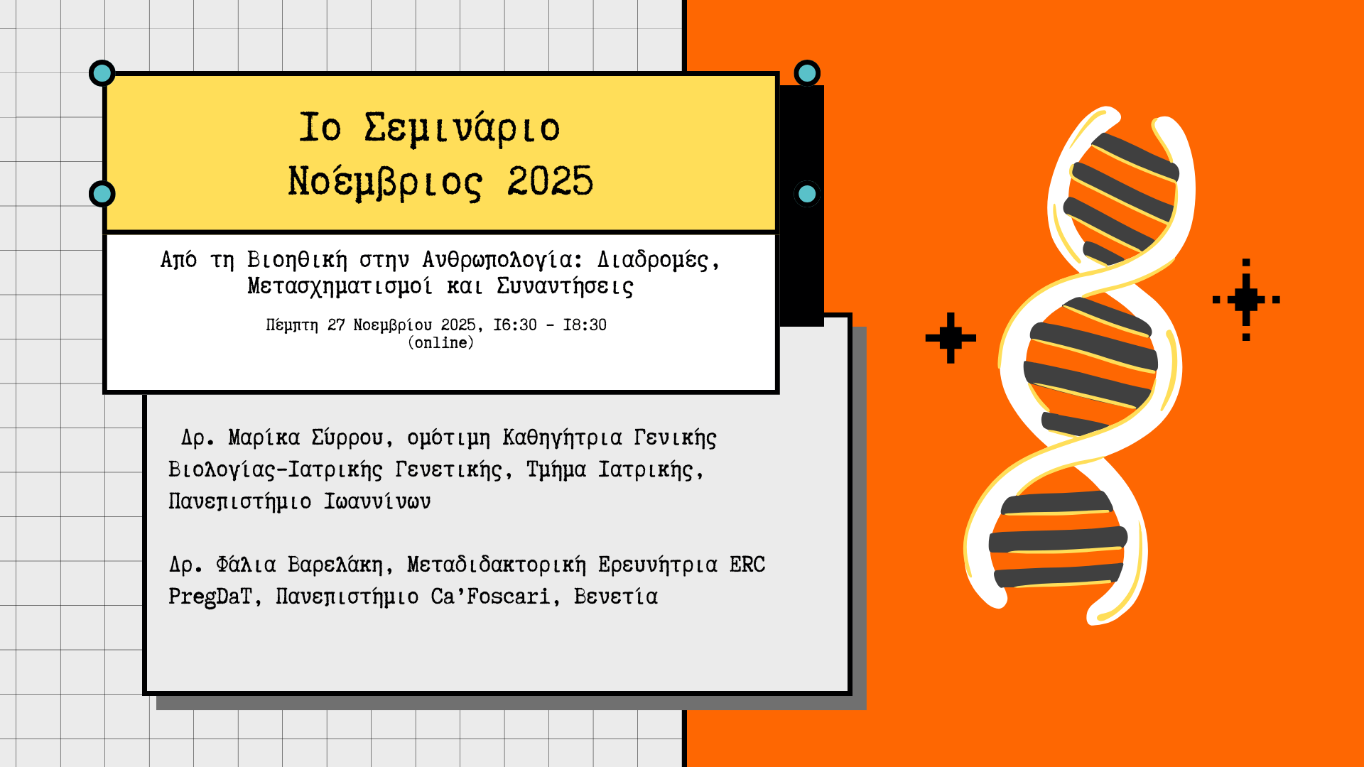1ο Σεμινάριο την Πέμπτη 27 Νοεμβρίου 2025 16:30 – 18:30 (online) με θέμα: «Από τη Βιοηθική στην Ανθρωπολογία: Διαδρομές, Μετασχηματισμοί και Συναντήσεις»