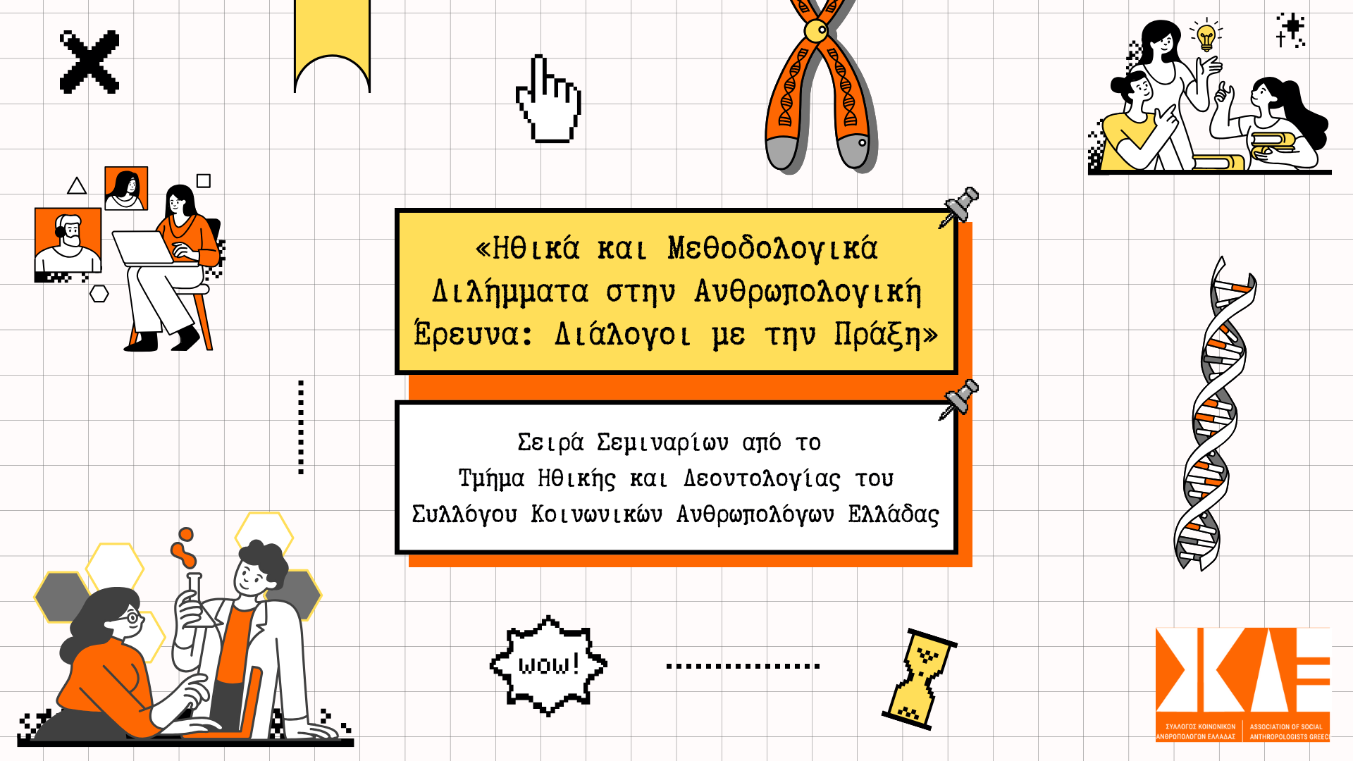 Το Τμήμα Ηθικής και Δεοντολογίας του Συλλόγου Κοινωνικών Ανθρωπολόγων Ελλάδας (ΣΚΑΕ) εγκαινιάζει μια νέα σειρά σεμιναρίων με τίτλο: «Ηθικά και Μεθοδολογικά Διλήμματα στην Ανθρωπολογική Έρευνα: Διάλογοι με την Πράξη». Η σειρά στοχεύει να ανοίξει έναν γόνιμο και συνεχή διάλογο γύρω από τα ηθικά και δεοντολογικά ζητήματα που προκύπτουν μέσα από την ανθρωπολογική πράξη, αλλά και να συμβάλει στη συλλογική επεξεργασία των μεθοδολογικών και πολιτικών προκλήσεων της εθνογραφικής έρευνας.